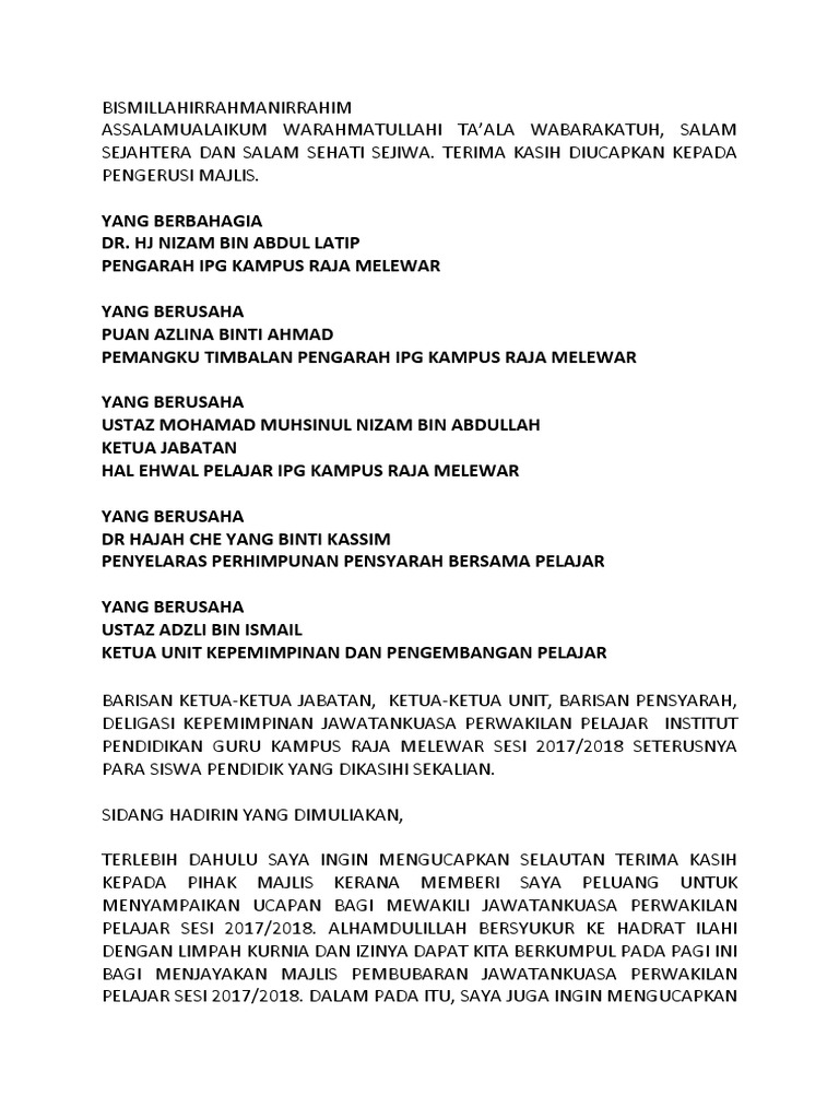 Rozali Bin Lebai Awang atas bacaan doa itu tadi. Contoh Teks Ucapan Pengerusi Majlis Mesyuarat Agung Tahunan. Encik Mugilraj AL Radhakrishnan.