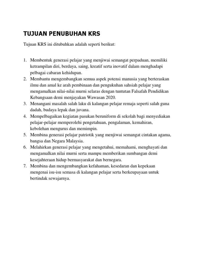 Objektif Penubuhan KRS. Mempelbagaikan kegiatan pasukan beruniform di sekolah bagi menyediakan pelajar-pelajar memperolehi pengetahuan pengalaman kemahiran kebolehan mengurus dan. Pada awal penubuhan pasukan ini dinamakan Tunas Kadet Remaja Islam Sekolah TKRIS.