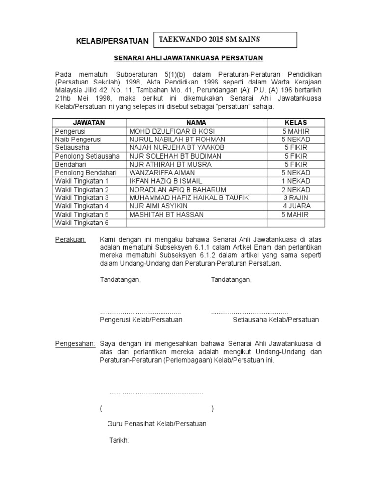 Rujuk Lampiran 3 15 Perlembagaan dan Peraturan-Peraturan Persatuan Rujuk Lampiran 4 16 Senarai Ahli Jawatankuasa Persatuan Rujuk Lampiran 5 17 Senarai Aktiviti Utama Persatuan Rujuk Lampiran 6 18 Surat pengesahan penubuhan dan pendaftaran Pasukan Pakaian Seragam KelabPersatuan dan Kelab SukanPermainan dari PengetuaGuru. Berikut merupakan senarai persatuan-persatuan yang terdapat di Malaysia. Persatuan Bahasa Arab 4.