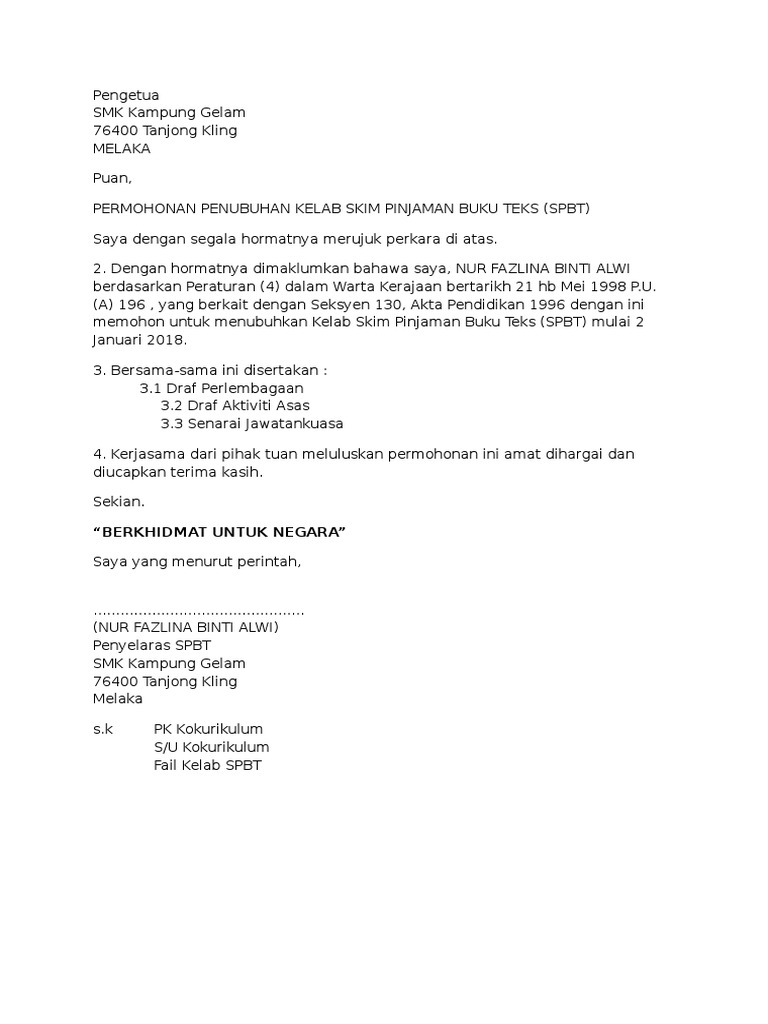 Surat Permohonan Penubuhan Kelab Spbt Pdf