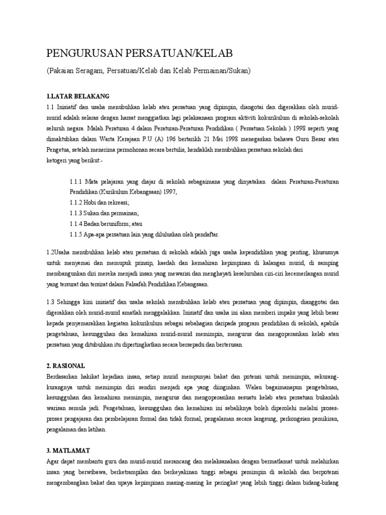 Berdasarkan mana-mana 4 Kelab Persatuan atau Unit beruniform Peralatan disimpan di tempat yang selamat. 3Oleh itu Akaun Perdagangan perlu disediakan. Usaha menubuhkan kelab atau persatuan di sekolah adalah juga usaha pendidikan yang penting khususnya untuk menyemai dan memupuk prinsip kaedah dan kemahiran kepimpinan di kalangan murid di samping membangunkan diri mereka menjadi insan yang mewarisi dan menghayati keseluruhan ciri-ciri kecemerlangan murid yang tersurat dan tersirat.
