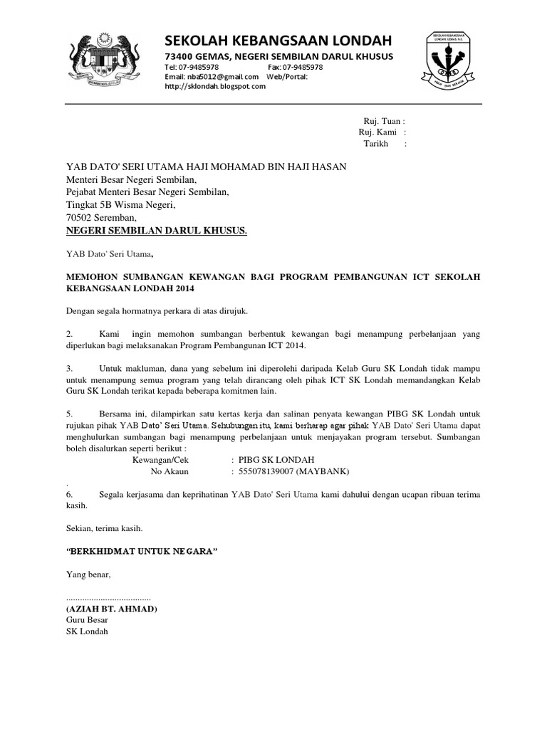 Contoh Surat Rasmi Memohon Sumbangan Memohon sumbangan kewangan bagi kelab guru dan kakitangan smk telok gadong dengan segala hormatnya perkara di atas dirujuk. Surat Memohon Kebenaran Mengadakan Program.