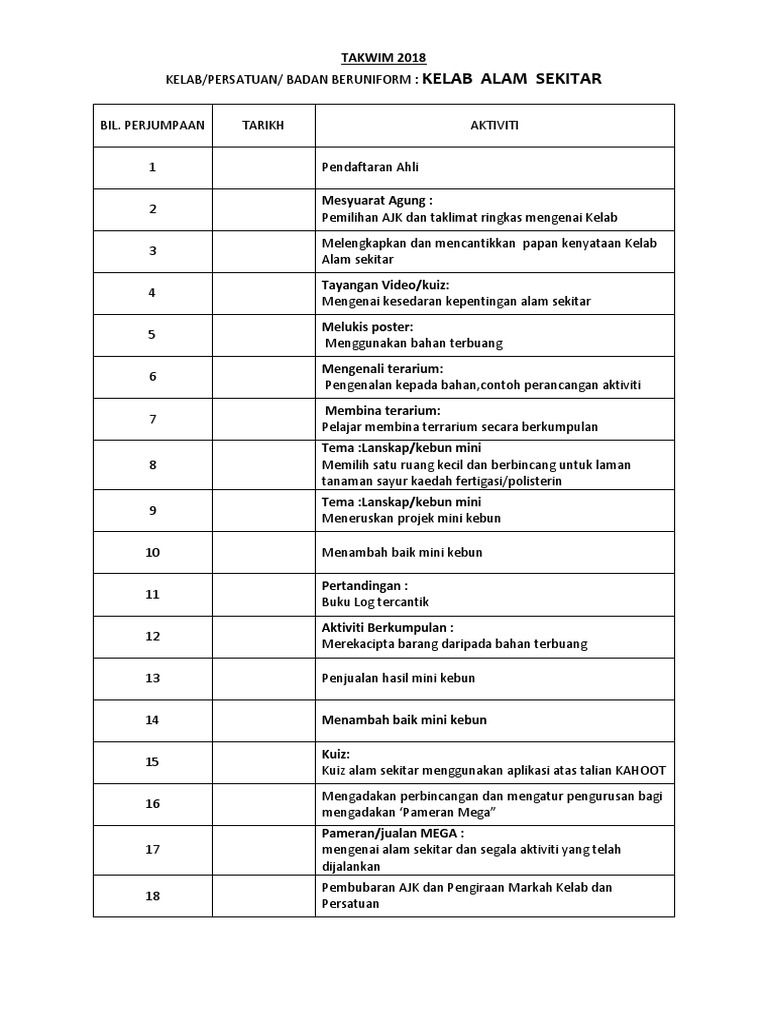 View Takwim Kelab Pencinta Alamdocx from FPPM AT19 at Sultan Idris University of Education. Jadual Pelaksanan Aktiviti Kelab Lestari Alam 2014 BIL PROGRAM OBJEKTIF STRATEGI SASARAN JANGKA MASA 2 Mesyuarat Agung Melantik AJK baru untuk mengetuai KLA Ahli-ahli memperkenalkan diri menjelaskan pengalaman lalu Pencalonan nama ahli Perlantikan berdasarkan undian terbanyak Semua ahli 3 Mesyuarat AJK AJK yang dilantik. Takwim Aktiviti Kelab KHdocx - Minggu Aktiviti Program Huraian Catatan Tarikh 1 Mesyuarat Agung Melantik AJK Lokasi Dewan Tahunan Merancang aktiviti.