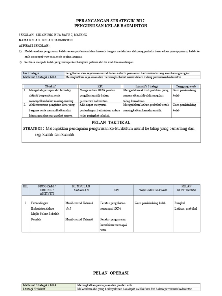 Pelan Strategik Kelab Kerjaya SMK Cheras 2019 -2021 November 24 2018 Kelab kerjaya pengurusan UBK Gambar Anugerah Kokurikulum di mana jaringan strategik bersama Klinik Kesihatan Cheras telah memberikan impak yang tinggi dengan kehadiran murid ke kelab meningkat kepada 88 berbanding 86 pada tahun 2017. Taktikal dan Operasi Kelab Persatuan Sukan Permainan Badan X X Uniform 15 Taklimat Sukaneka X X. Pelan taktikal tjawab tempoh sumber output indikator prestasi pelan kontigensi catatan.