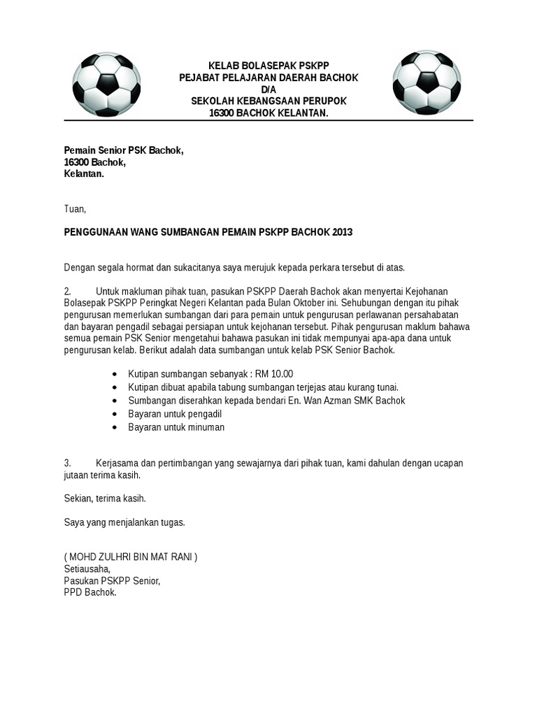 Surat sumbangan untuk kelab. Surat mohon sumbangan 1. Wang ini akan digunakan untuk membeli hadiah dan doorgift kepada semua guru dan staf. Surat Mohon Sumbangan PIBD.