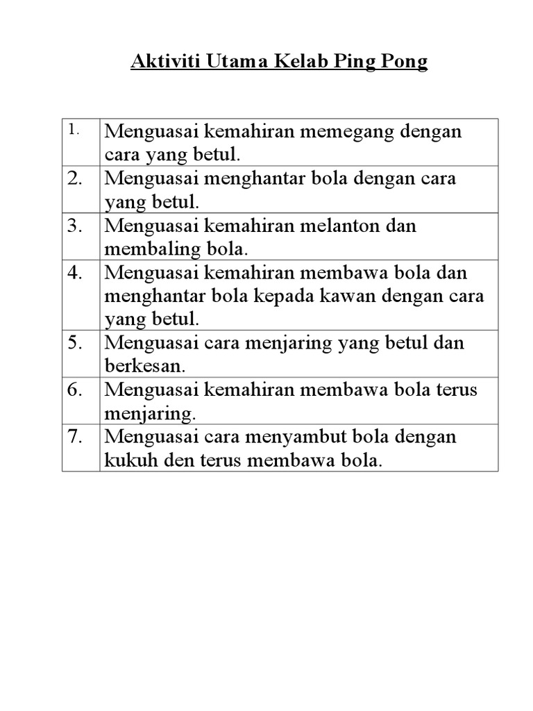 Aktiviti Utama Kelab Ping Pong Pdf